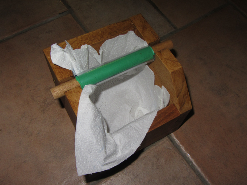 Abschließend das Moosgummi in den Schlauch einlegen und das Rundholz (vorzugsweise ebenfalls lackiert) eingeführt. Um Ärger mit der Regierung zu vermeiden habe ich noch Gummifüße unter den Kasten geklebt und fertig!