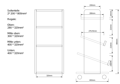 Als Material habe ich 18mm Buchenleimholz verwendet, welches ich für billig und umsonst im Baumarkt zurecht sägen ließ. Somit blieben nur die Bohrarbeiten übrig und die Montage der Rollen.