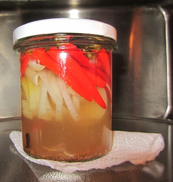 Die gewaschenen und entstielten, möglichst superscharfen Peperonen in ein sauberes Schraubdeckelglas geben, einige Zwiebelringe, eine in Streifen geschnittene Knoblauchzehe hinzufügen und die Gewürze Zucker, Salz und - nach eigenem Ermessen - auch eine Nelke, etwas Piment und eine Prise Garam Masala einstreuen.