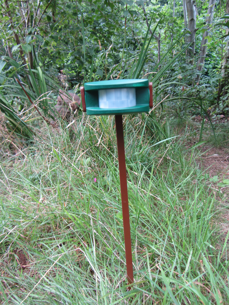 Also baute ich so ein einfaches Teil aus Flacheisen, doch als ich den Halter des Bewegungsmelders aus dem Revier holen wollte, war auch der geklaut. Wer - bitteschön - klaut einen Plastikbügel und macht sich auch noch die Mühe, die Schrauben rauszudrehen?